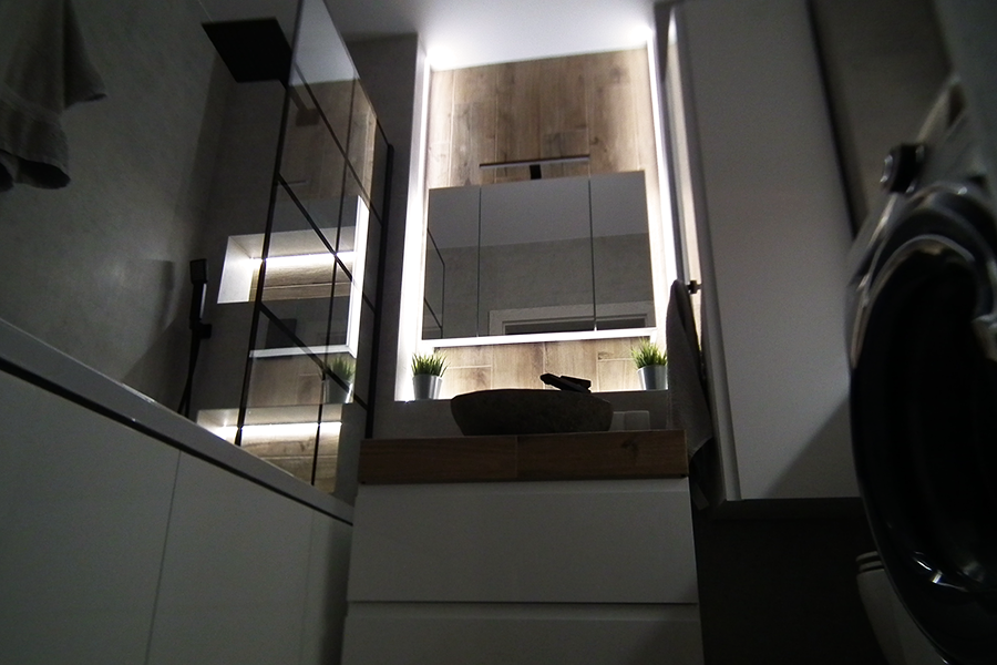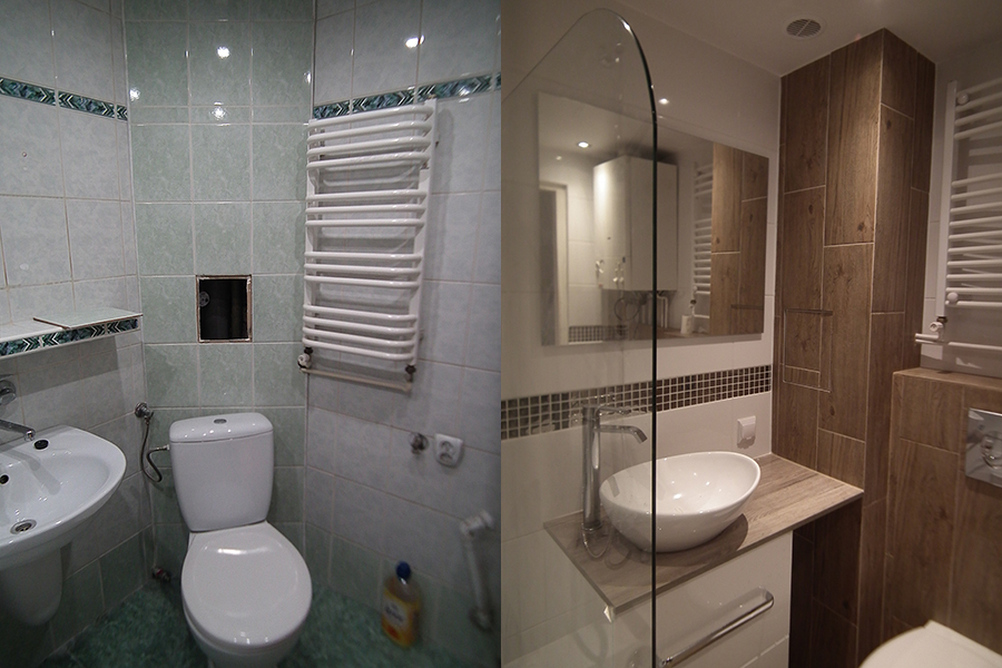 Łazienka została wykonana według naszego projektu, instalacja wodna żeliwna została wymieniona na instalację polipropylenową w technologii zgrzewanej, instalacja kanalizacyjna została przesunięta i rozbudowana oraz dokonaliśmy przeróbek instalacji elektrycznej. Sufit został podwieszony na stelażu a pomieszczenie oświetlone czterema punktami led. Ściany zostały wyłożone glazurą wymiarów 40 cm x 25 cm oraz przedzielone pasem szklanego, lustrzanego dekoru. Posadzka, półki z glazury, zabudowy pionów wod-kan oraz stelaża podtynkowego zostały wyłożone gresem drewnopodobnym wymiarów 60 cm x 18,5 cm. Umywalka nablatowa została zamontowana na podwieszanej szafce wraz z blatem łazienkowym a deszczownica wraz ze szklanym parawanem umożliwiają korzystanie z wanny również w formie natrysku.
