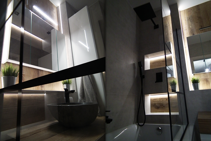 Niektóre łazienki mają za sobą smutną historię pełną budowlanej fantazji oraz wykonawców którzy pracę porzucali. Taka była też historia tej łazienki zanim nie stała się naszą nową przyjaciółką. Dokonaliśmy przeróbek wodno kanalizacyjnych, rozbudowaliśmy elektrykę o dodatkowe punkty elektryczne oraz podświetlenie sufitu taśmą led którą ukryliśmy wewnątrz występu z płyt gipsowo kartonowych. Sufit został podwieszony na stelażu krzyżowym przymocowanym do drewnianego stropu kamienicy. Ze względu na zbyt dużą krzywiznę oraz odchył ścian od pionu wykluczyliśmy możliwość przyklejenia płyt gipsowo kartonowych do ścian na kleju gipsowym i zastosowaliśmy M-System firmy Atlas oraz wykonaliśmy hydroizolację tej samej firmy. Trzy ściany oraz zabudowa wanny zostały obłożone gresem mrozoodpornym wymiarów 60 x 60 cm natomiast posadzka, jedna ze ścian oraz zabudowa stelaża wc zostały obłożone gresem drewnopodobnym o wymiarach 90 x 17,5 cm. Ze względu na konieczność dużego odsunięcia stelaża od ściany wykonaliśmy dwie wnęki zabudowane glazurą. Całość została dopełniona przez czarne elementy wyposażenia począwszy od baterii wannowej i umywalkowej, włączników świateł, kontaktu czy nawet osłony na wentylator oraz dodatków łazienkowych. Pożądany efekt został osiągnięty a łazienka odczarowana.